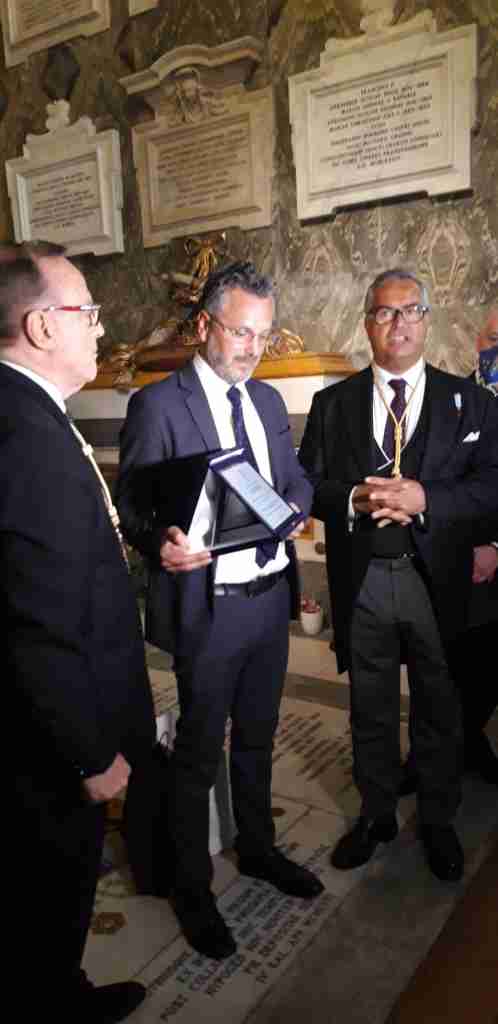 Infine, a nome di S.A.R. Il Duca di Calabria, è stata consegnata una targa di riconoscimento al Comandante del Nucleo dei Carabinieri per la Tutela del Patrimonio Culturale (TPC) di Napoli, Maggiore Giampaolo Brasili per l’opera di recupero di ottantadue documenti storici databili tra il 1798 e il 1893, riconducibili al periodo borbonico napoletano e appartenenti al Fondo denominato «Carte della Regina Maria Carolina – Archivio Borbone» custodito presso l’Archivio di Stato di Napoli. Le carte dei Borbone trafugate, in vendita su piattaforme di e-commerce per documenti storici, sono state restituite all’Archivio di Stato di Napoli il 26 settembre 2021, in occasione delle Giornate del Patrimonio Europeo [QUI].
