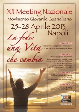 Al via oggi a Napoli, nel quartiere di Secondigliano, il XII meeting nazionale del Movimento Giovanile Guanelliano, l’appuntamento che annualmente riunisce i giovani delle realtà orientate dal carisma del santo comasco per un incontro di preghiera e di festa. 150 giovani in arrivo dal centro e sud Italia (Calabria, Lazio, Campania, Puglia e Sicilia) si incontreranno dal 25 aprile fino a domenica 28 sul tema «La Fede: una vita che cambia», in sintonia con l’Anno della Fede inaugurato lo scorso ottobre da Benedetto XVI.
