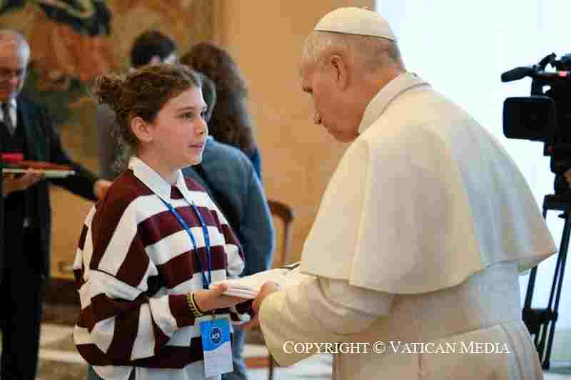 “Che bello incontrarci a pochi giorni dal Natale del Signore! Saluto con affetto tutti voi, il Presidente nazionale, l’Assistente ecclesiastico generale, insieme all’équipe nazionale dell’ACR, agli educatori e ai collaboratori che vi accompagnano. Vi ringrazio molto sinceramente per l’entusiasmo che esprimete e che condividete con noi altri, molto bello, veramente testimoniando la bellezza della fede e la bellezza dell’Azione Cattolica. Il nome della vostra associazione dice bene la sua identità: siete discepoli di Gesù, testimoni del suo Vangelo e compagni di viaggio insieme con tutta la Chiesa”.