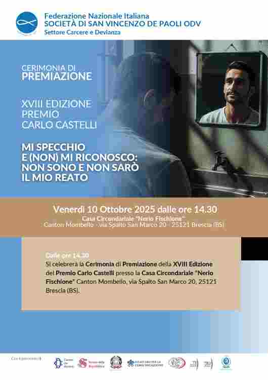 Oggi si svolge la 18^ edizione del Premio Carlo Castelli. La cerimonia di premiazione inizierà alle ore 14.30, presso la Casa Circondariale ‘Nerio Fischione’ di Canton Mombello (Via Spalto San Marco 20, Brescia). Il concorso letterario nazionale giunto alla sua XVIII edizione è rivolto a tutti i detenuti degli istituti penitenziari italiani, compresi quelli minorili. E’ promosso dalla Federazione Nazionale Italiana Società di San Vincenzo De Paoli ODV con la collaborazione del Comune di Brescia, il patrocinio della Camera dei Deputati, del Senato della Repubblica e del Ministero della Giustizia e il riconoscimento della Medaglia del Presidente della Repubblica Sergio Mattarella.