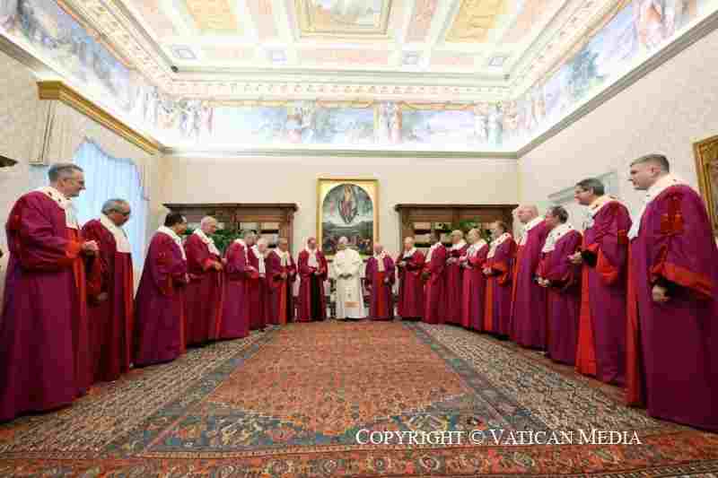 Cari amici, la vostra missione è alta ed esigente. Siete chiamati a custodire la verità con rigore ma senza rigidità e a esercitare la carità senza omissione. In questo equilibrio, che è in realtà una profonda unità, si deve manifestare la vera sapienza giuridica cristiana”.