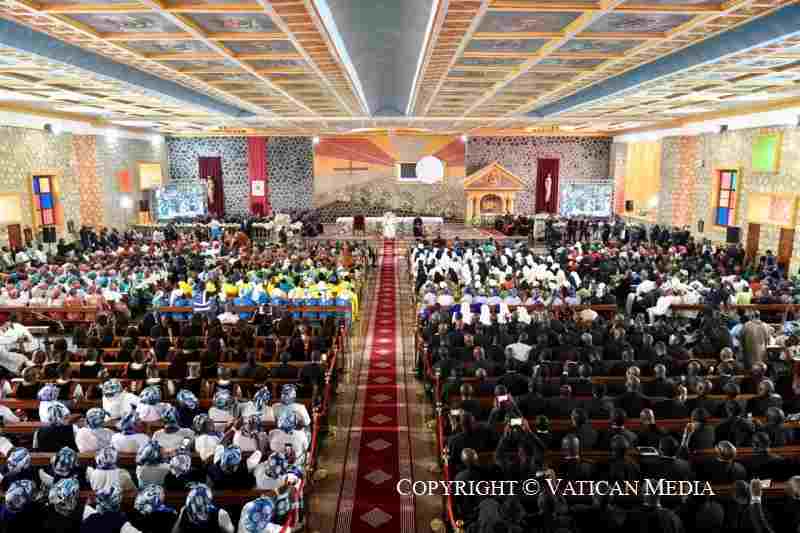 Partendo dalla profezia di Isaia che annuncia la pace il papa ha esortato a non scoraggiarsi nell’annuncio: “Mi ha accolto con queste parole, e ora vorrei rispondere: quanto sono belli anche i tuoi piedi, polverosi da questa terra macchiata di sangue ma fertile che è stata maltrattata, eppure è ricca di vegetazione e frutta. I tuoi piedi ti hanno portato fino a qui, e nonostante le difficoltà e gli ostacoli, sono rimasti sulla strada della bontà. Che tutti noi continuiamo sulla via della bontà che conduce alla pace.