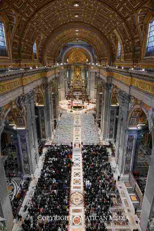 L’omelia è terminata con il messaggio dell’Apocalisse (‘Grazia a voi e pace da Gesù Cristo, il testimone fedele, il primogenito dei morti e il sovrano dei re della terra’): “Questo saluto fa sintesi del cammino di Gesù in un mondo conteso tra potenze che lo devastano. Al suo interno sorge un popolo nuovo, non di vittime, ma di testimoni. In quest’ora oscura della storia è piaciuto a Dio inviarci a diffondere il profumo di Cristo dove regna l’odore della morte. Rinnoviamo il nostro ‘sì’ a questa missione che ci chiede unità e che porta la pace. Sì, noi ci siamo! Superiamo il senso di impotenza e di paura! Noi annunciamo la tua morte, Signore, proclamiamo la tua risurrezione, nell’attesa della tua venuta”.
