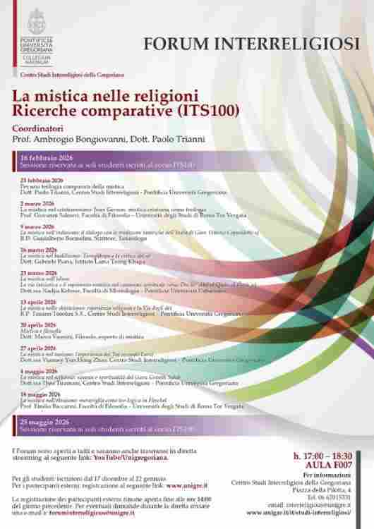 Per questo motivo la Pontificia Università Gregoriana organizza i forum sulla ‘mistica nelle religioni. Ricerche comparative’, coordinati dai professori Ambrogio Bongiovanni e Paolo Trianni che iniziano lunedì 23 febbraio con una lezione introduttiva sul tema ‘Per una teologia comparata della mistica’ tenuta dal prof. Trianni, che analizzano il fenomeno mistico nelle varie religioni. Il corso è interamente dedicato all’analisi dell’esperienza mistica nelle diverse tradizioni religiose: il cristianesimo, l’induismo, il buddhismo, l’islam ed il mondo cinese. I Forum sono aperti a tutti e saranno anche trasmessi in diretta streaming al link YouTube/Unigregoriana previa registrazione al seguente link: www.unigre.it per i partecipanti esterni fino alle ore 14:00 del giorno precedente. Per eventuali domande durante la diretta inviare una e-mail a foruminterreligious@unigre.it .