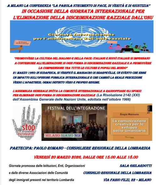 In occasione della Giornata internazionale per l’eliminazione della discriminazione razziale, oggi dalle ore 15.00 alle 18.00, si terrà a Milano la conferenza dal titolo ‘La Parola strumento di Pace, di Verità e di Giustizia’, che si svolgerà presso la Sala Ghilardotti di Palazzo Pirelli, sede del Consiglio Regionale della Lombardia, in via Fabio Filzi 22.